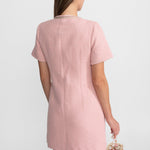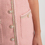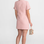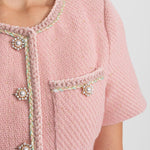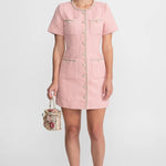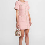 İnci Düğmeli Kısa Kollu Tweed Mini Elbise – Pudra Pembe