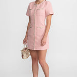 • Pudra Pembe Kısa Kollu, İnci Düğme Detaylı Tweed Mini Elbise