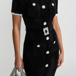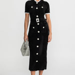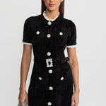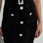 • Siyah Elegant Midi Elbise – Kristal Düğmeli & Dantel Detaylı