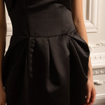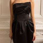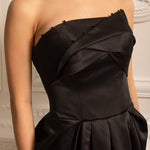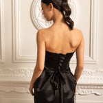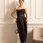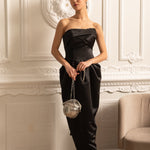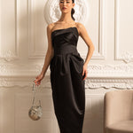 • Büzgülü Göğüs Detaylı Siyah Straplez Midi Elbise